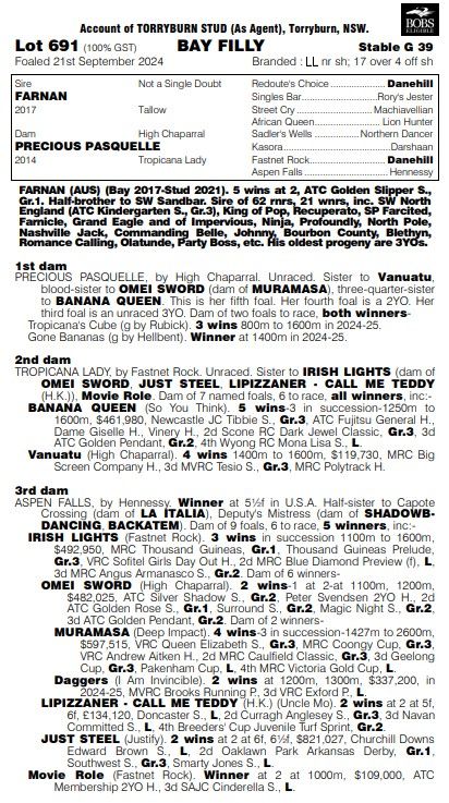 Very exciting to be able to purchase a filly of the quality of the FARNAN X PRECIOUS PASQUELLE ‘24. Her sire Golden Slipper winner FARNAN has got out of the blocks quickly siring 4 stakeswinners from his 1st crop and looks set to make his mark! His best 2 stakeswinners are bred exactly the same as this filly and this makes her even more appealing.