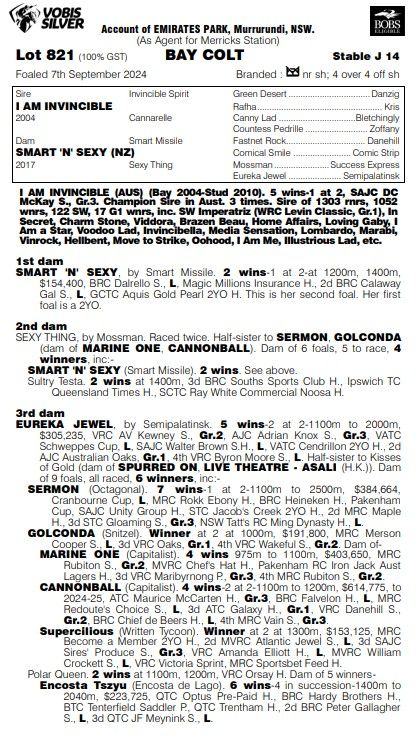 I AM INVINCIBLE – Champion Australian Sire (2021/22 & 2022/23 & 2023/24) … Leading Australian Sire by winners x 5 … Champion First Season Sire & Champion Sire of 2YOs … 17 Group 1 winners inc. Imperatriz (10 Group 1s), Home Affairs, Viddora, Brazen Beau, Loving Gaby, Marabi, Hellbent and 2025 Group 1 Sires’ Produce winner Vinrock AND dual 2025 Group 1 winner Charm Stone etc. … 122 stakes winners … progeny earnings of over $230 million … yearlings have sold up to $3 million.