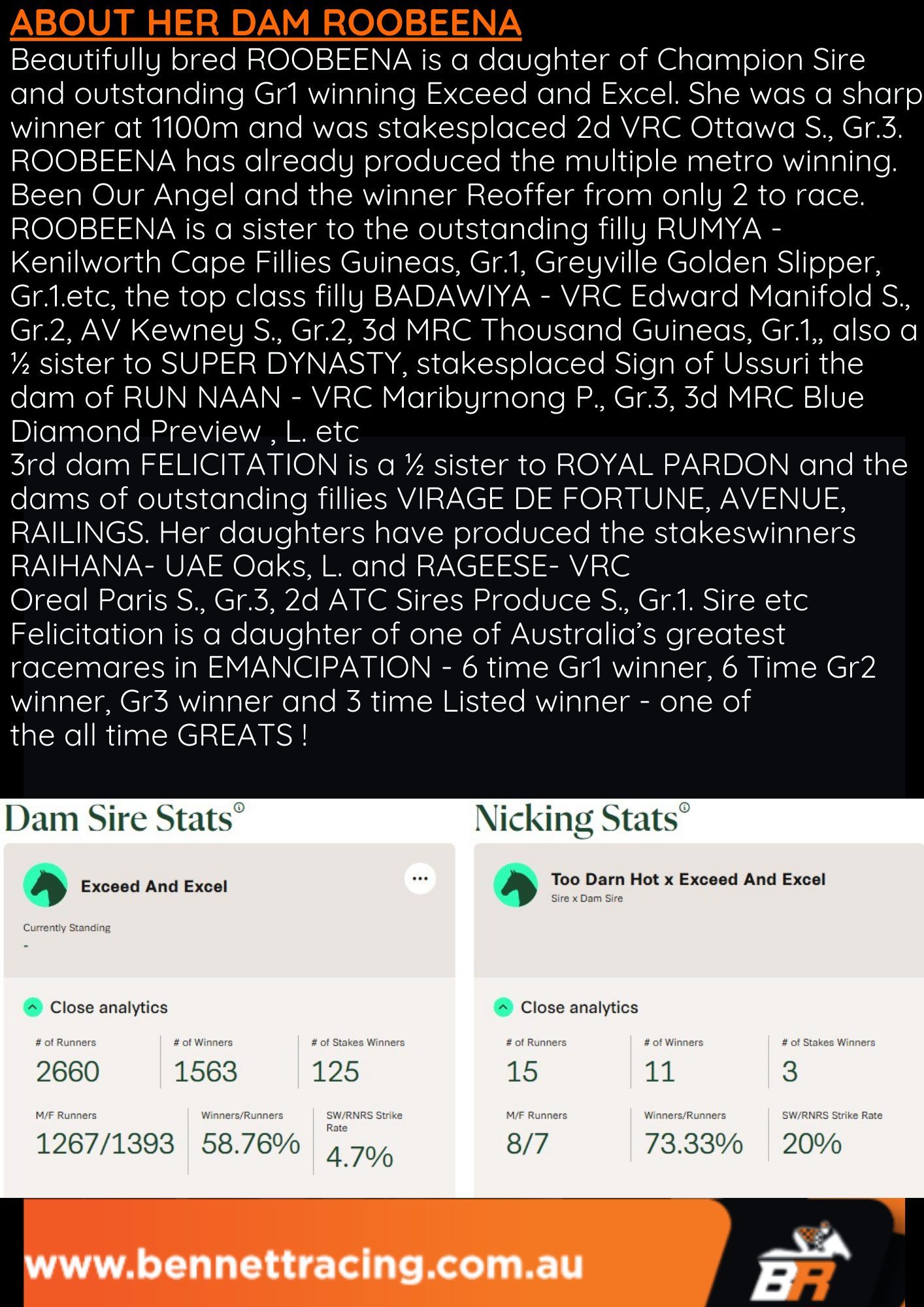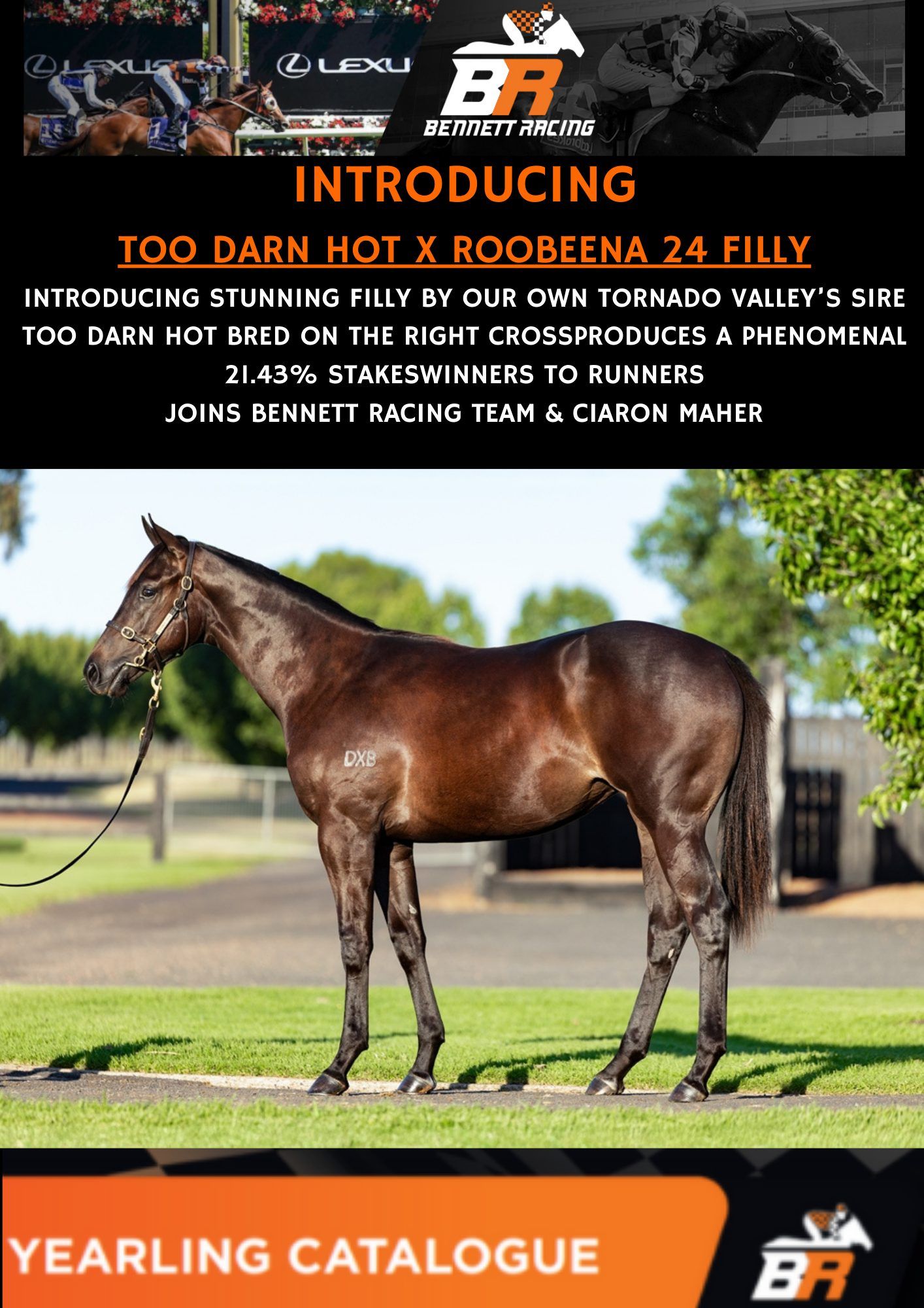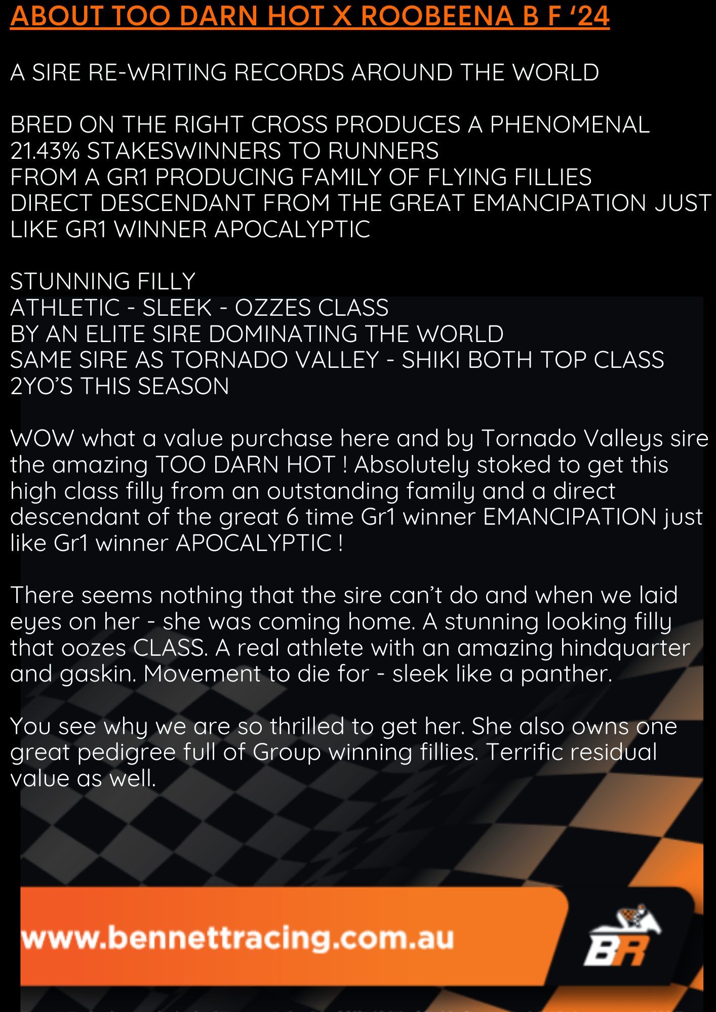 Un-named (Too Darn Hot – Roobeena) 1 Year Old Brown or Black Filly Profile Sire: Too Darn Hot Colour: Brown or Black Dam: Roobeena Sex: Filly Age: 1 Foaled: Oct 09, 2024 Country: Australia Silks: Request share ownership in this horse CLICK BELOW IMAGE BRED RAISED & SOLD BY ONE OF AUSTRALIA’S LEADING NURSERIES SEGENHOE STUD