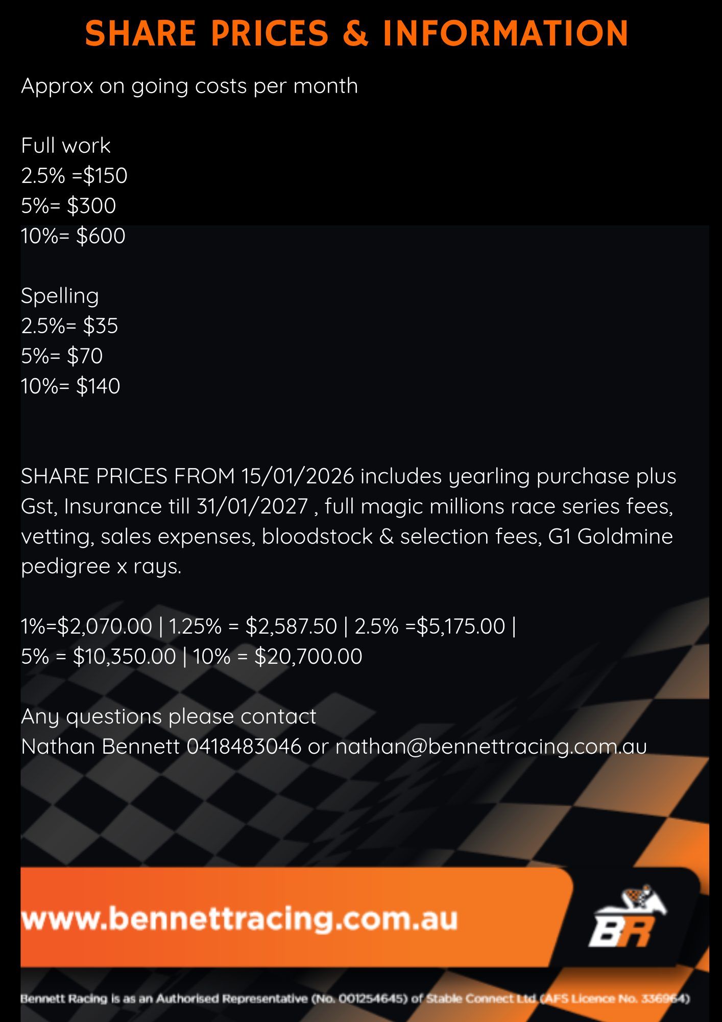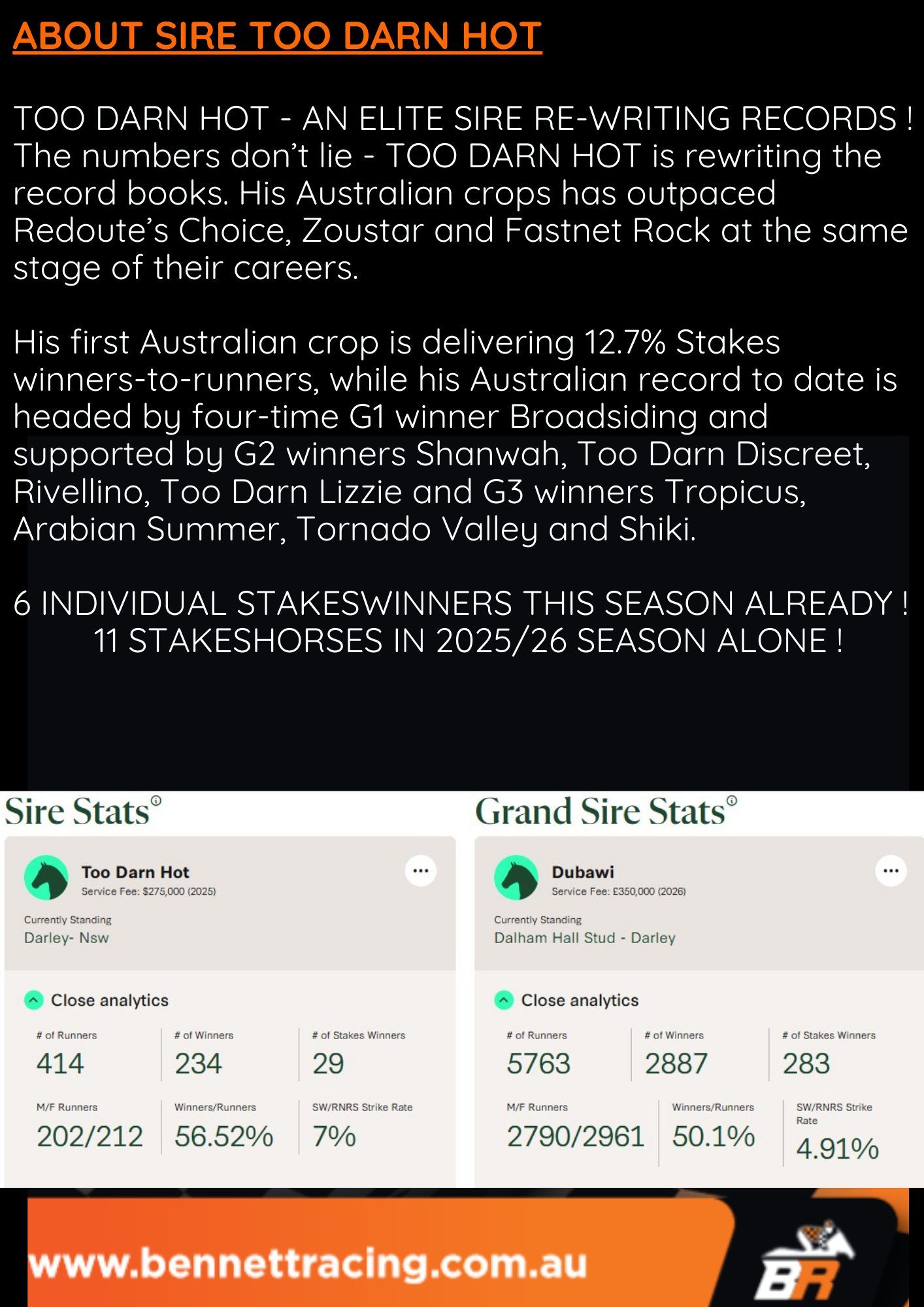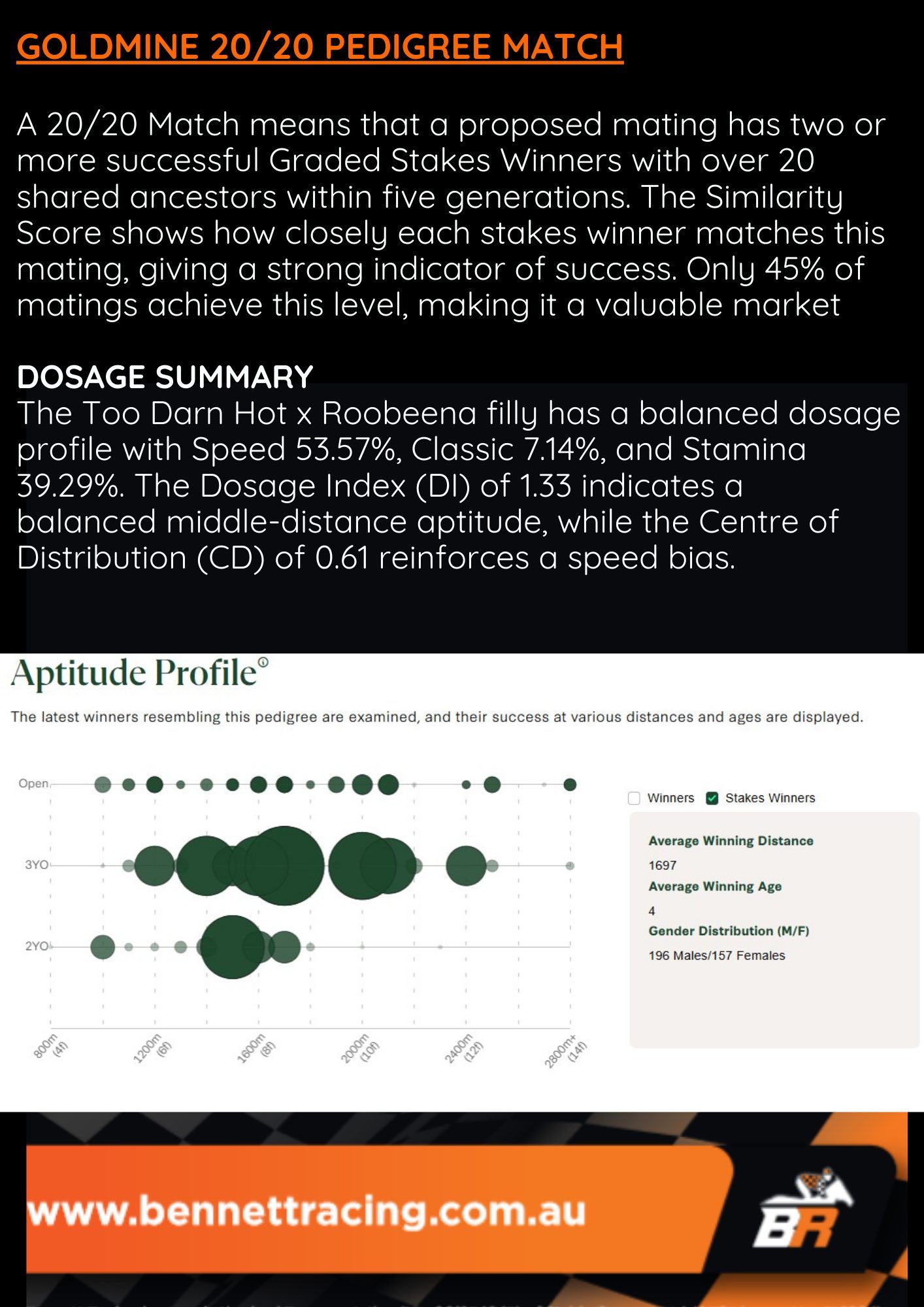 Un-named (Too Darn Hot – Roobeena) 1 Year Old Brown or Black Filly Profile Sire: Too Darn Hot Colour: Brown or Black Dam: Roobeena Sex: Filly Age: 1 Foaled: Oct 09, 2024 Country: Australia Silks: Request share ownership in this horse CLICK BELOW IMAGE BRED RAISED & SOLD BY ONE OF AUSTRALIA’S LEADING NURSERIES SEGENHOE STUD