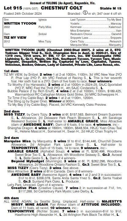 Just a well put together colt that has that good big WRITTEN TYCOON action and that WRITTEN TYCOON “LOOK”. A colt that’s pretty hard to fault and bred on a terrific WRITTEN TYCOON X SNITZEL CROSS that works !