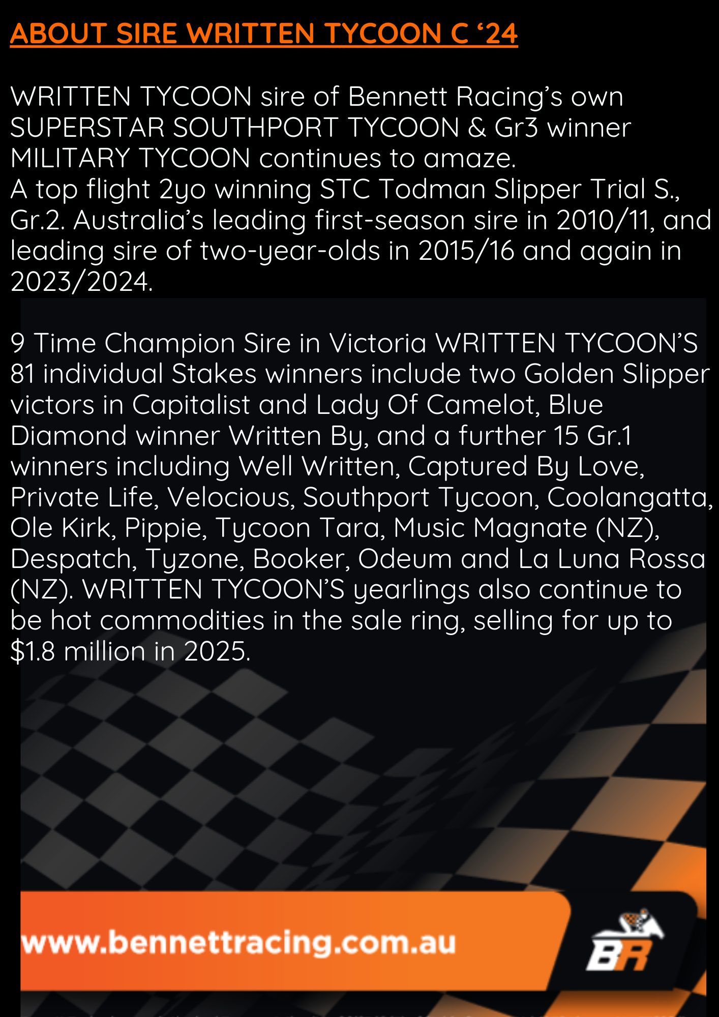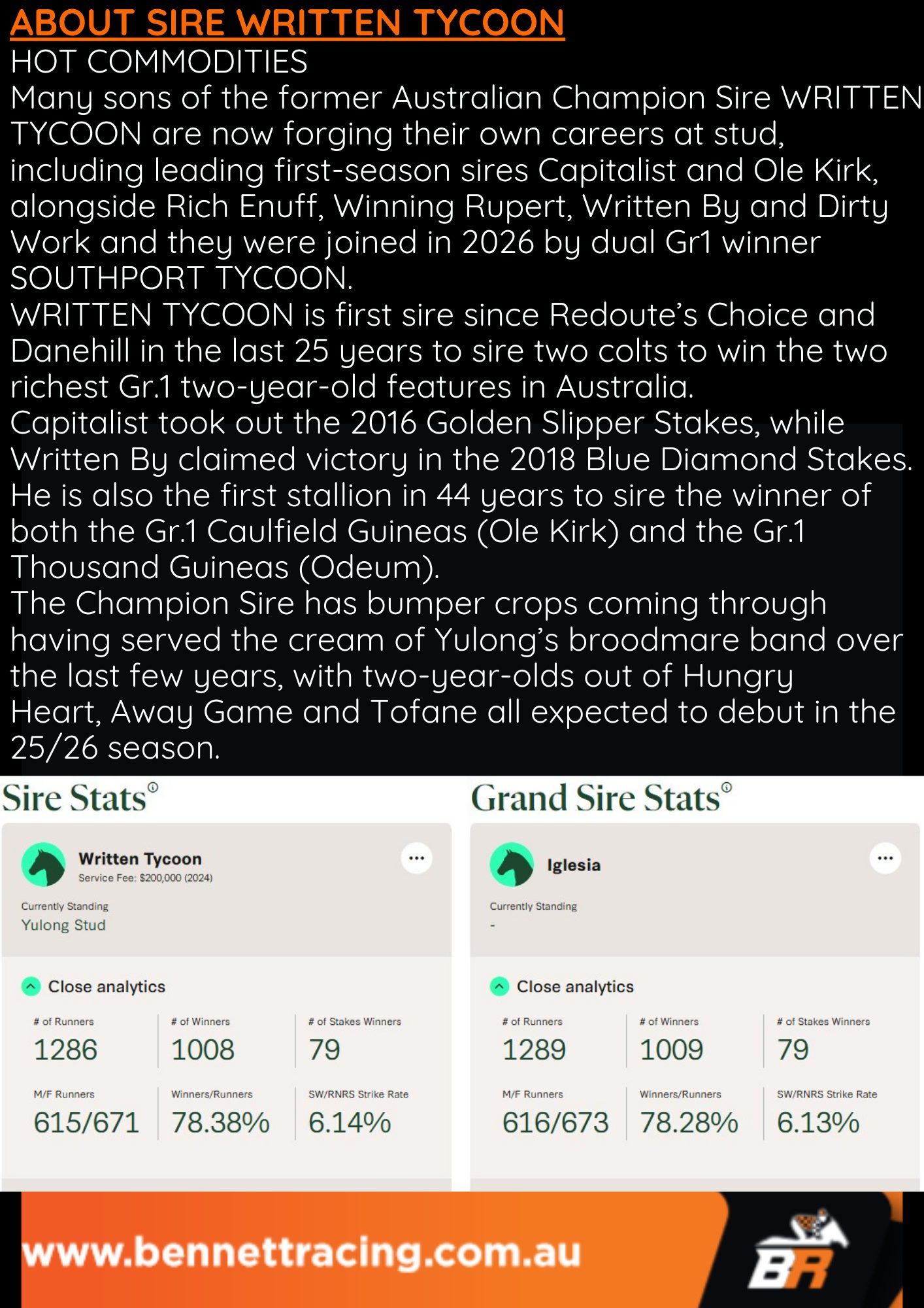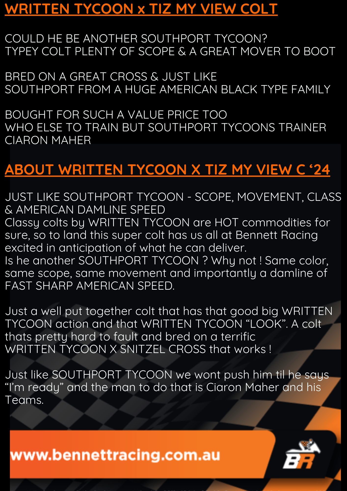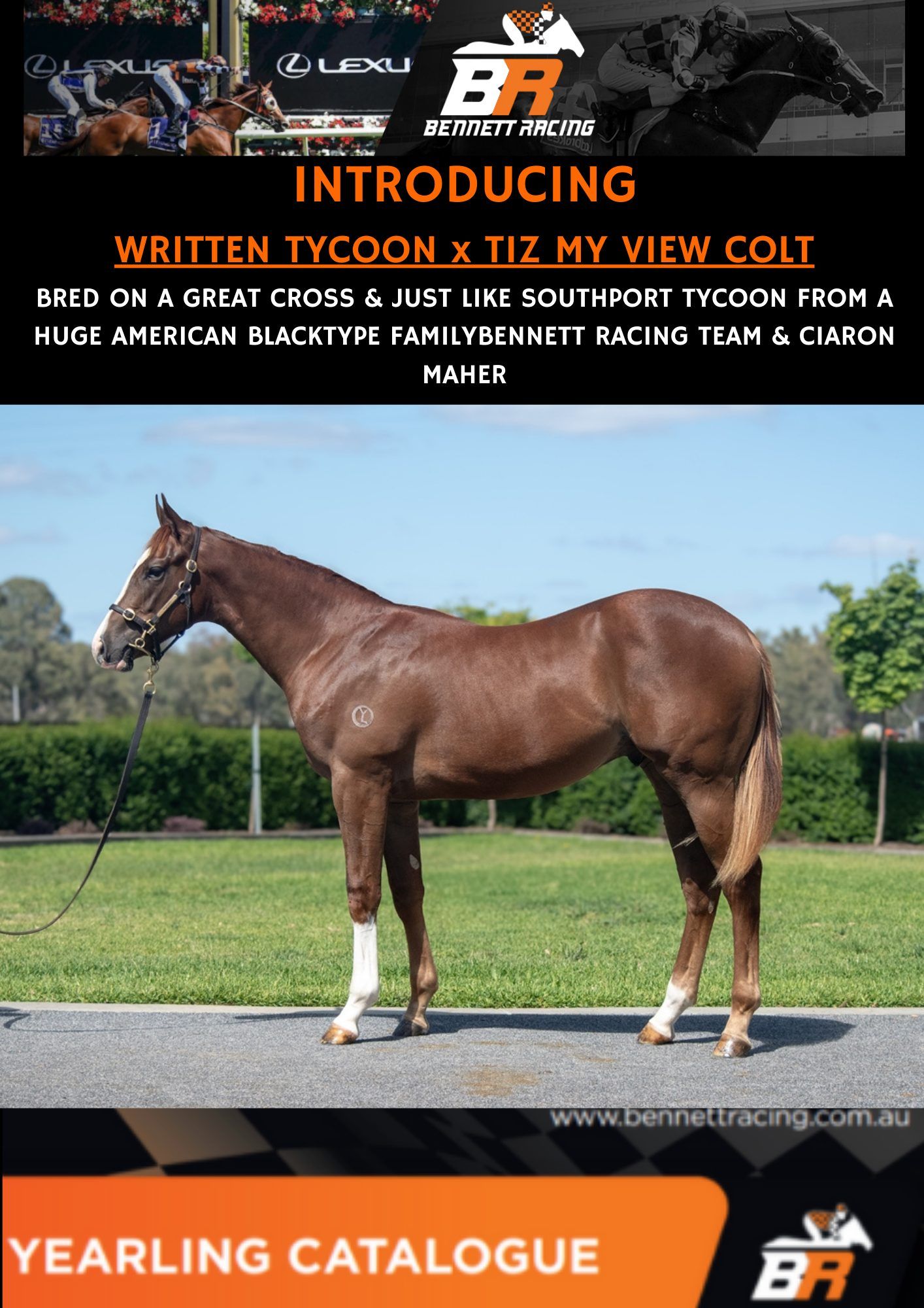 Un-named (Written Tycoon – Tiz My View) 1 Year Old Chestnut Colt Profile Sire: Written Tycoon Colour: Chestnut Dam: Tiz My View Sex: Colt Age: 1 Foaled: Oct 24, 2024 Country: Australia Silks: Request share ownership in this horse CLICK BELOW IMAGE ABOUT WRITTEN TYCOON X TIZ MY VIEW C ‘24 DOSAGE SUMMAR BRED RAISED & SOLD BY ONE OF AUSTRALIA’S LEADING NURSERIES YULONG STUD